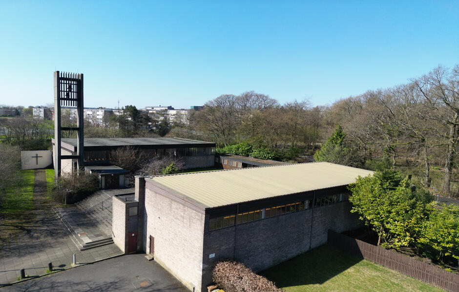 Sophisticated modernist Parish Church and connecting hall featuring a 4-stage bell tower in the busy town of Cumbernauld.